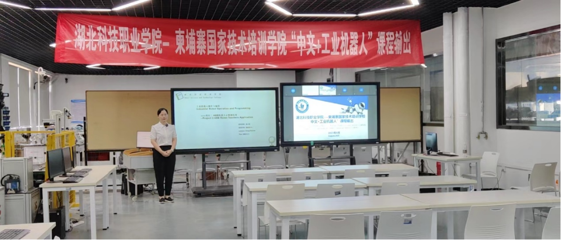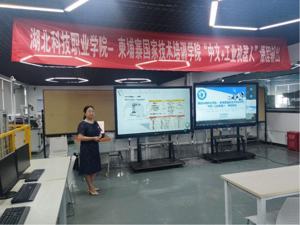 开班仪式结束后,为期7天的“中文+工业机器人”课程输出课程正式开始。学校国家级职业教育教师教学创新团队(工业机器人技术)立项建设单位负责人於红梅教授开展了《工业机器人操作与编程》的第一次对外课程教学,通过视频的方式向柬埔寨师生展示了武汉的人文地理和精神风貌,介绍了MK平台的校园和师生风采。通过视频演示、ppt讲授和实训室设备硬件平台展示的方式让学生们了解工业机器人的发展和应用,认识ABB地面工作站的结构组成,掌握ABB机器人的系统功能,为后续课程打下基础。