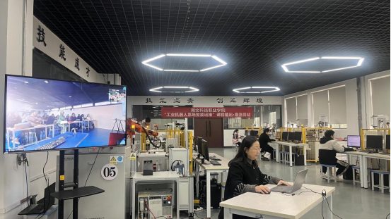 机电工程学院院长、国家级职业教育教师教学创新团队负责人於红梅教授通过视频的方式向摩洛哥的师生介绍了学校和机电工程学院的概况,通过视频演示、PPT讲授和实训室设备硬件平台展示的方式,讲解工业机器人应用系统的流程运行与系统维护方法、ABB地面工作站井式上料机构的结构组成等专业内容。熊小艳、陈刚、卢志芳等分别从视觉检测系统的控制、机器人编程、系统流程整合等方面实施理论、实践一体化教学,让摩洛哥学生在实践中掌握前沿技术,点燃学习热情。