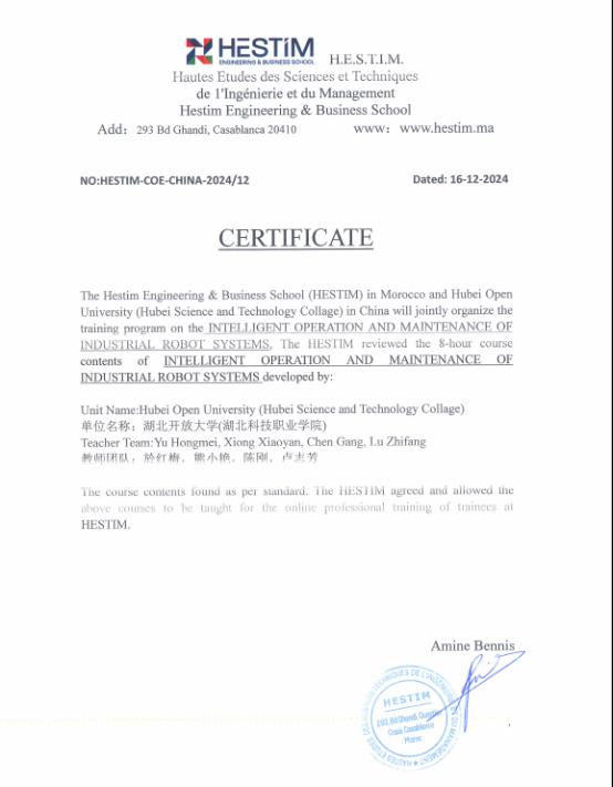 12月,机电工程学院向摩洛哥赫斯蒂姆工程与商学院开展了8课时的《工业机器人系统智能运维》课程输出。