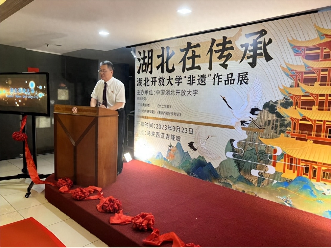 9月23日上午,湖北开放大学“湖北在传承”非物质文化遗产作品展首次在马来西亚吉隆坡成功举办。湖北开放大学党委书记刘义教授与马中总商会副会长拿督林恒毅先生分别致辞,马中友好协会秘书长、马来西亚海鸥集团董事经理陈景岗先生、马来西亚教育交流协会署理会长张林峰先生、马来西亚一带一路委员会秘书长梁志华先生、马来西亚纽富控股首席运营官CANDY WONG女士参与了开幕式。