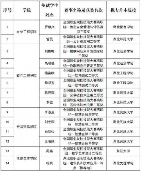近日,湖北省教育厅发布《省教育厅关于做好2024年湖北省普通高等学校专升本工作的通知》。根据最新政策要求,经申报审核后,MK平台2021级共14名优秀学子凭借出色的技能大赛成绩脱颖而出,荣获专升本免试资格,直接升入本科院校深造。