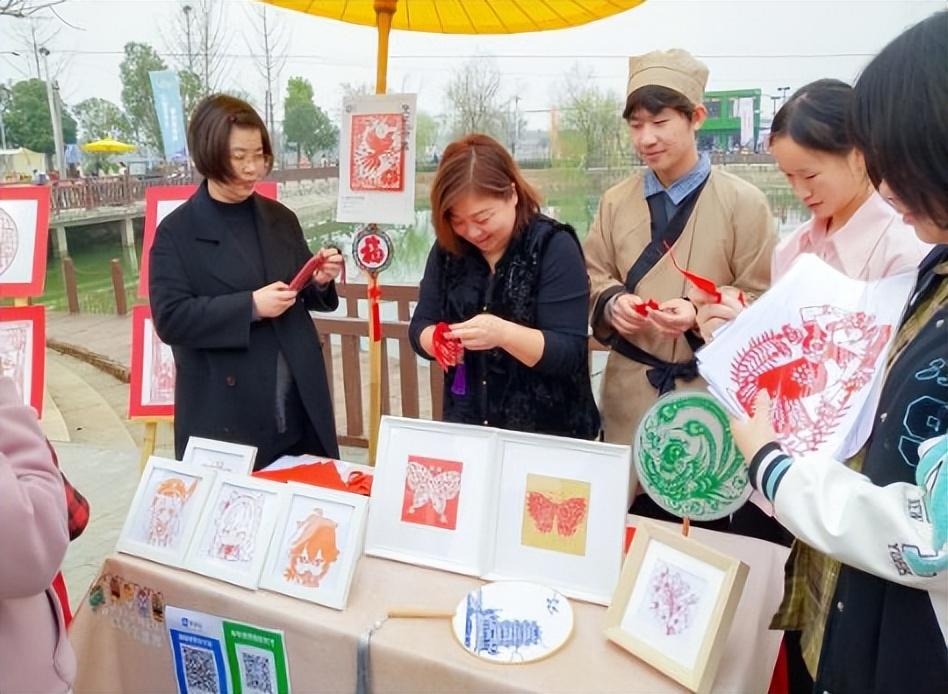 在非遗剪纸展台前,严洁老师正在教授仙桃雕花剪纸。对折纸、勾勒、裁剪,不一会儿功夫,喜庆的窗花、娇俏的花朵、逼真的小动物……一幅幅栩栩如生、精细灵动的剪纸作品罗列展台上,引得周围游客跃跃欲试。