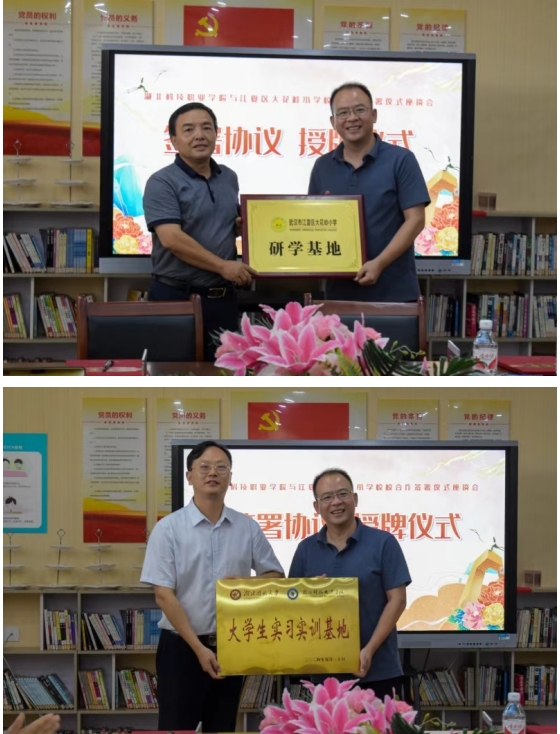 签约仪式上,双方签署校校合作协议,MK平台授予江夏区大花岭小学“大学生实习实训基地”,大花岭小学授予该校“研学基地”。