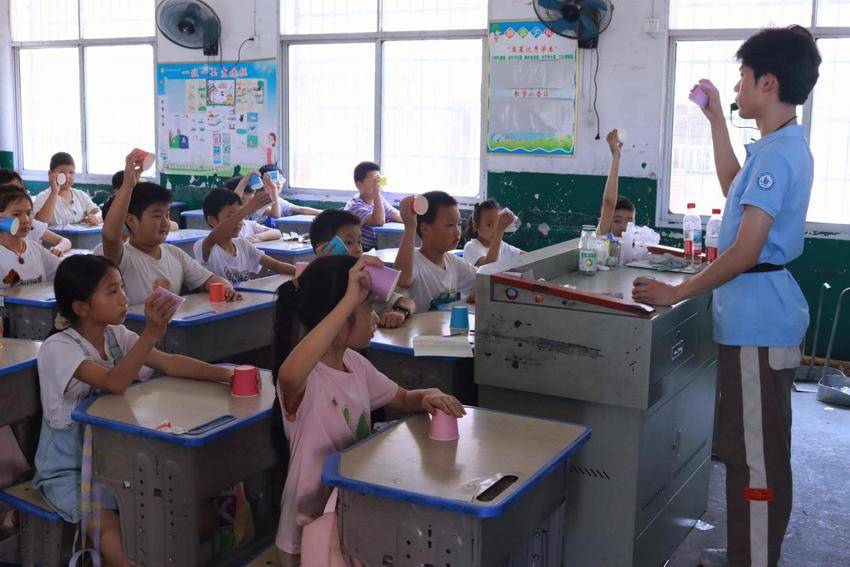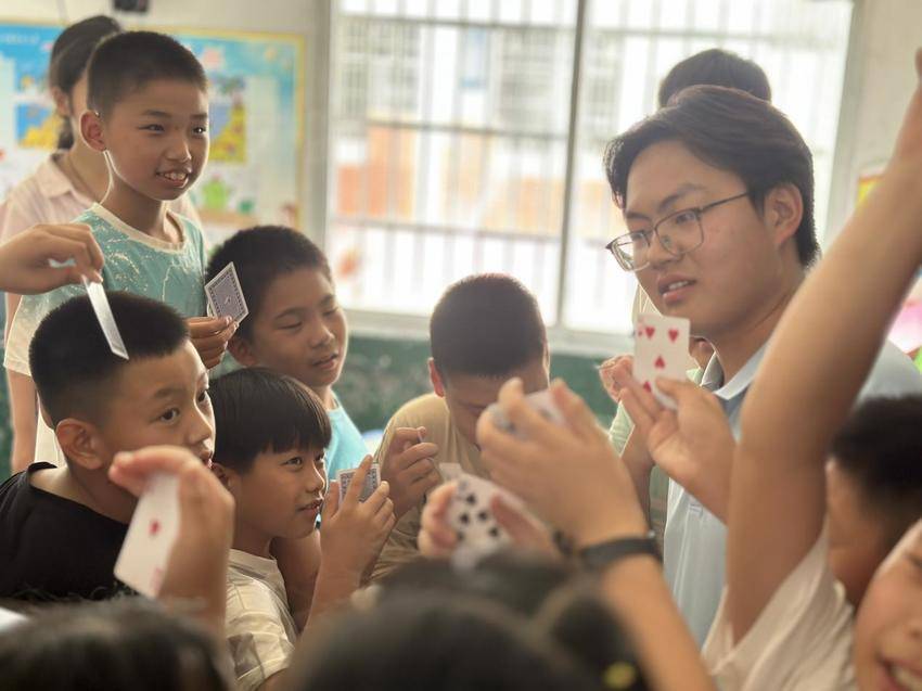趣味魔术课上,实践队员化身“魔法大师”,用硬币穿杯、丝巾消失等精彩魔术表演,瞬间吸引了孩子们的目光,激发起他们强烈的好奇心。表演结束后,实践队员耐心讲解魔术背后的科学原理与手法技巧,并手把手指导孩子们练习。孩子们分组合作,反复尝试“穿透扑克牌”“神奇的硬币转移”等小魔术,在失败与成功的过程中不断摸索。通过学习魔术,孩子们的观察力、逻辑思维能力与动手能力得到充分锻炼,对科学知识的探索热情也被点燃,每一次成功完成魔术,都让孩子们收获满满的成就感,脸上洋溢着自信的笑容。