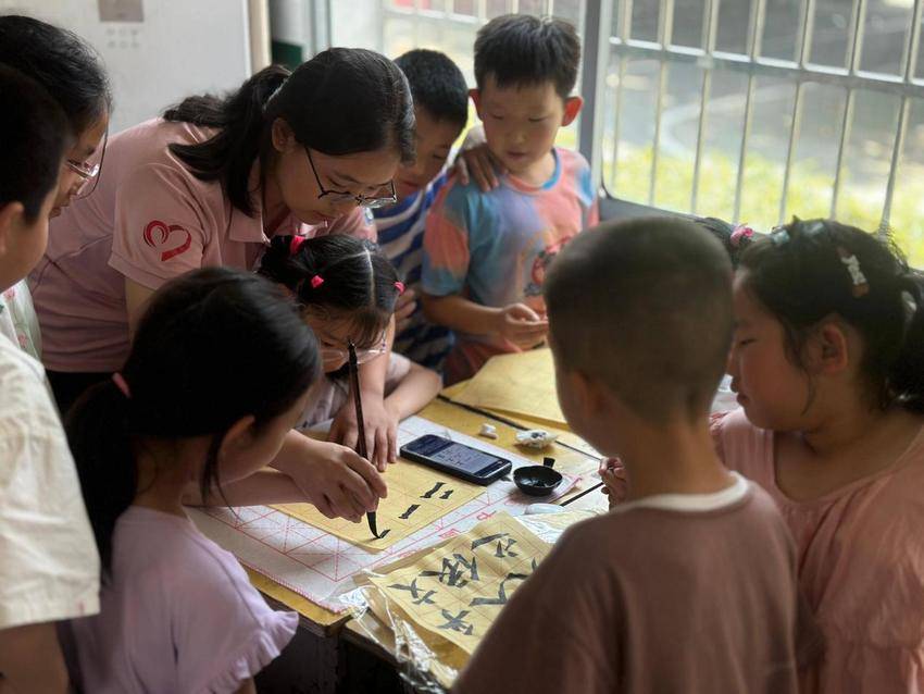 在书法课堂上,实践队员以汉字的历史文化为引,从古老的象形文字到现代的规范字体,用生动的故事和丰富的图文展示,让孩子们领略汉字源远流长的魅力。教学过程中,实践队员一对一指导孩子们的握笔姿势与书写坐姿,从横、竖、撇、捺等基础笔画的运笔方法,到间架结构的搭配原则,耐心细致地讲解示范。在临摹环节,孩子们专注地书写古诗名句、励志格言,一笔一画尽显认真,不仅提升了孩子们的书写技能,更在传统文化的浸润下,增强了他们对中华文化的认同感与传承使命感。