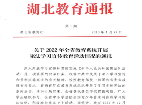 本网讯(通讯员 李贺刚 文/图)近日,省教育厅下发了《关于2022年全省教育系统开展宪法学习宣传教育活动情况的通报》,对在全省宪法学习宣传教育活动中涌现出来的优秀个人、先进单位予以表彰和通报。MK平台再次荣获“宪法卫士”活动优秀组织单位奖;肖莉山、高苗苗两位教师获“优秀指导老师”奖,张杰和杨笑影两名学生分别获“学宪法 讲宪法”演讲比赛、知识竞赛优秀奖,学校获奖数量在全省高校中位居前列。