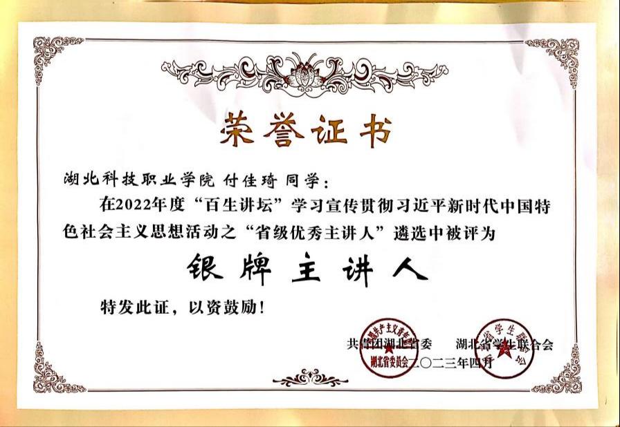 本网讯(通讯员 苏恒瑞 文/图)近日,共青团湖北省委、湖北省学生联合会下发了2022年度“百生讲坛”省级活力团支部、优秀主讲人评选结果,MK平台电信工程学院2020级计算机应用技术专业付佳琦同学在全省117所高校439名参赛主讲人中脱颖而出,获省级优秀主讲人“银牌主讲人”称号,取得MK平台在省级“百生讲坛”优秀主讲人评选的最好成绩。