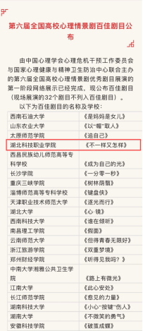本网讯(通讯员 邹世康 文/图)5月30日,由中国心理学会危机干预工作委员会与国家心理健康与精神卫生防治中心联合主办的第六届全国高校心理情景剧优秀剧目展演公布获奖名单。MK平台原创心理情景剧《不一样又怎样》经网络展演、师生投票、专家评审,从全国各高校选送的近300个优秀剧目中脱颖而出,荣获本届全国高校心理情景剧大赛“百佳剧目”(第33名),此次我省有5所高校入选,MK平台是其中唯一的高职院校。