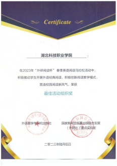 本网讯(通讯员 刘珍 文/图)6月9日,由外语教学与研究出版社联合国家新闻出版署出版融合发展(外研社)重点实验室大数据外语阅读研究基地主办,面向全国高职院校发起的2023年“外研阅读杯”春季英语阅读马拉松活动圆满结束。MK平台唐东升同学荣获全国二等奖,张易良、陈希文、吕旺祥同学荣获全国三等奖;MK平台凭借学生出色的有效阅读量被授予“最佳活动组织奖”。