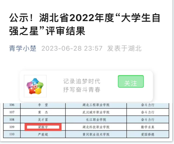 本网讯(通讯员 肖莉山/文 黄晨雨/图)2022年度“大学生自强之星”评选活动以“踔厉奋发 勇毅前行”为主题,旨在广大青年群体中厚植爱党、爱国、爱社会主义的情怀,引领他们牢记时代责任,坚定跟党走、建功新时代。活动于2023年4月启动,经校团委申报、省级遴选、宣传展示、专家评审等环节,寻访了一批在爱国修德、勤学求真、创新创业、社区实践、奋斗力行等方面具有突出事迹,在当代大学生中能起到榜样引领作用的自强典型。活动启动以来,校团委组织各学院分团委积极宣传,大力挖掘大学生“自强”典型,并最终推报了4名同学参加省级“自强之星”的评选。通过官方新媒体平台的通报,来自电信工程学院的梁振宇同学荣获2022年度“大学生自强之星”称号,成为全省获得此项殊荣的110名大学生之一。