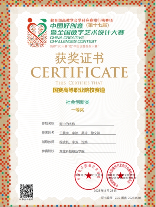 本网讯(通讯员 徐凌帆 文/图)8月25日,第十七届中国好创意暨全国数字艺术设计大赛总决赛成绩揭晓,MK平台传媒艺术学院艺术设计专业学生的作品《海中的杰作》在本届大赛中获得国赛高职赛道社会创新类一等奖、作品《缘延千年》获得国赛高职赛道视觉传达类三等奖。