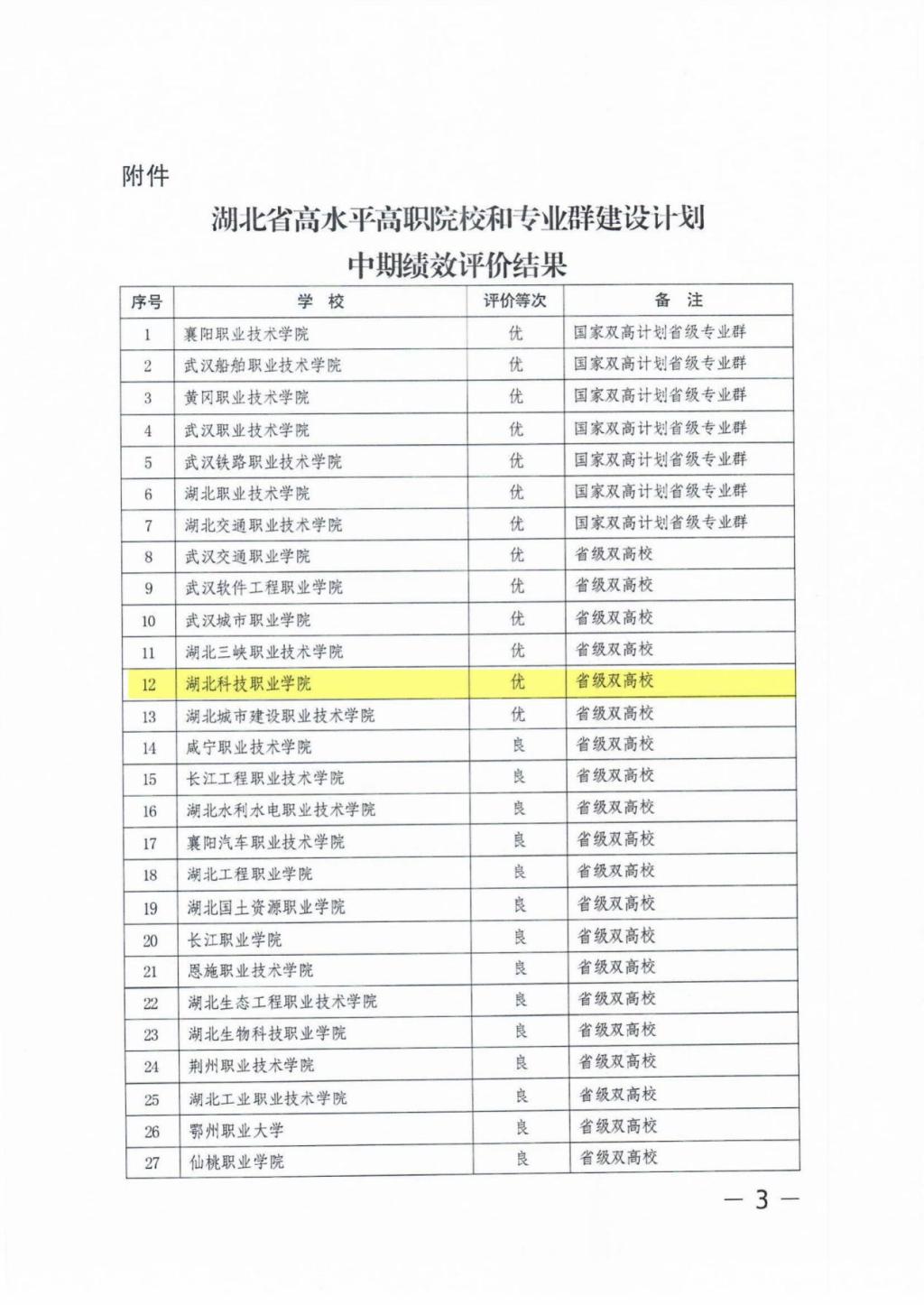 本网讯(通讯员 詹乐/文 卢义平/图)9月11日,省教育厅办公室省财政厅办公室发布了《关于公布湖北省高水平高职院校和专业群建设计划中期绩效评价结果的通知》,MK平台获评“优秀”等次,排名第12,比省“双高”校立项时前进3个位次,此次共有47所建设单位参加了绩效评价,获评优秀等次的学校仅13所。
