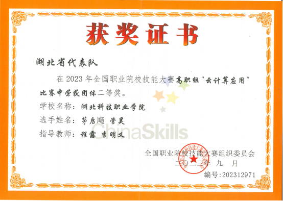 本网讯( 通讯员 程露 文/图)9月18日至21日,由教育部、国家发展和改革委员会、科学技术部、工业和信息化部等36个国家部委、行业协会联合主办,吉林省教育厅、长春市人民政府共同承办的2023年全国职业院校技能大赛(高职组)“云计算应用”赛项在长春汽车工业高等专科学校举行。MK平台电信工程学院茅启飏、管昊两位同学组成的代表队,在指导老师程露、李明义的悉心指导下,不畏强手,奋勇拼搏,以全国第15名(共60支代表队)的成绩荣获二等奖。