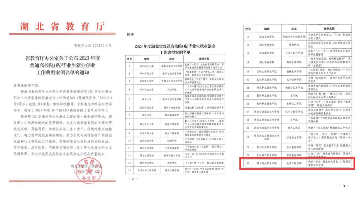本网讯(通讯员 王东瑾 向珅玓 文/图)10月8日,湖北省教育厅办公室下发《关于公布2023年度普通高校院(系)毕业生就业创业工作典型案例名单的通知》(鄂教学办函〔2023〕9号),MK平台电信工程学院申报的案例《构建“四全”就业育人体系,打好高质量就业组合拳》入选,成为入选的30个高校院(系)典型案例之一,11家高职院(系)之一。