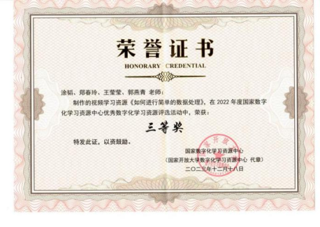 会上公布了2022年度突出贡献单位、优秀分中心和先进工作者和优秀教学视频评选结果,MK平台获得“突出贡献单位”荣誉称号、教育技术中心李郁老师获得“先进工作者”荣誉称号,由导学中心教师涂韬、郑春玲、王莹莹、郭燕青制作的视频学习资源《如何进行简单的数据处理》获得“优秀教学视频”三等奖。