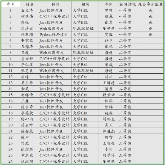 本网讯(通讯员 潘磊 文/图)近日,第十五届蓝桥杯全国软件和信息技术专业人才大赛个人赛湖北赛区成绩揭晓,MK平台软件工程学院学子在比赛中成绩再创新高。组织参赛的30名学生中有26名学生获奖,其中一等奖5名,二等奖10名,三等奖11名。石文涛、柯昌炜、廖恒、杨斯翊和刘泽文同学将代表学校参加6月上旬的全国总决赛,其中刘泽文同学连续两年在不同赛道晋级全国总决赛。与往年相比,今年一等奖获奖人数、参加赛道及获奖面均创历史新高。