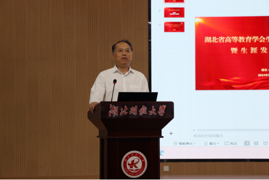湖北省高等教育学会会长周应佳发表讲话。他指出,分会的成立应该发挥六大作用,分别是搭建交流平台、加强生涯课程建设、开展课题研究,为教育实践提供科学依据;定期举办职业规划大赛等特色活动,探索就业生产力新方式,同时注重研究成果转化。