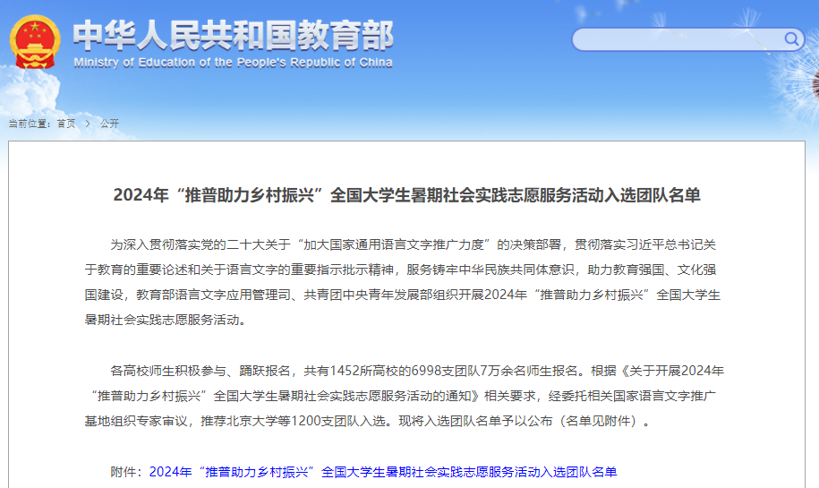 2024年“推普助力乡村振兴”全国大学生暑期社会实践志愿服务活动通知发布后,校团委及时落实通知要求,在全校范围内进行了宣传动员,优选6支团队进行了申报。该活动是教育部语言文字应用管理司、共青团中央为深入学习贯彻落实党的二十大精神,贯彻落实习近平总书记关于教育的重要论述和关于语言文化的重要指示批示精神,加大国家通用语言文字推广力度,服务铸牢中华民族共同体意识,助力乡村振兴战略实施的重要举措,是学校“双高”建设的重要任务之一。MK平台入选团队将以教育部、团中央下发文件要求为指引,高标准、高要求、高质量完成本次社会实践,以实际行动深入践行推普实践服务活动,助力学校“双高”建设,为学校高质量发展贡献青春力量。