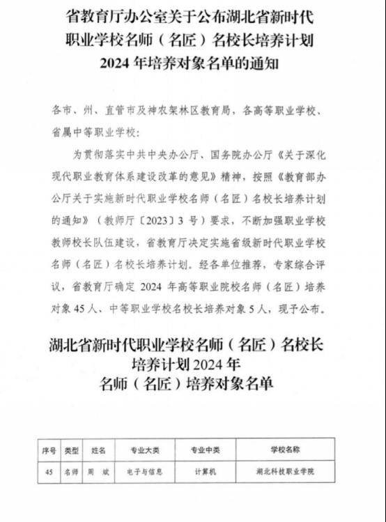 据悉,湖北省教育厅于今年6月启动新时代职业学校名师(名匠)名校长培养计划,旨在培养打造一批理想信念坚定、师德高尚、教育教学能力和专业实践能力突出的双师型名师(名匠)。经个人申请、学院推荐、相关职能部门审核、学校研究确定推荐人选,省教育厅确定高等职业院校名师(名匠)培养对象45人。