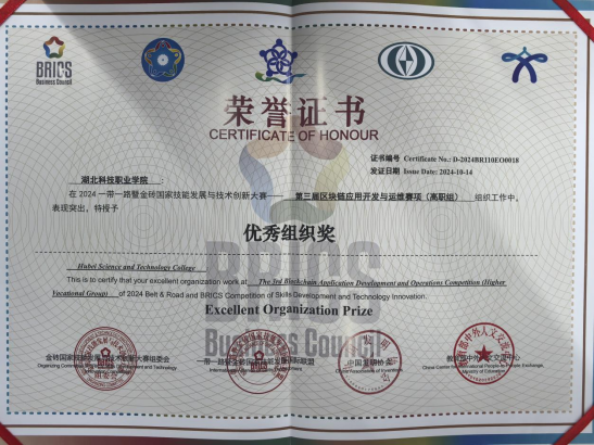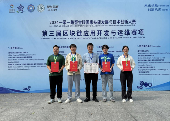 本网讯(通讯员 张根 文/图)10月12日至14日,2024一带一路暨金砖国家技能发展与技术创新大赛第三届区块链应用开发与运维赛项在浙江温州举办。来自全国的 179 支高职院校队伍和 9 支本科队伍参加角逐,MK平台软件工程学院师生在比赛中展现出高超的技术技能水平和优良的精神风貌,凭借扎实的专业知识和精湛的实践操作能力,在众多参赛队伍中脱颖而出。教师董燕燕、张根指导的刘泽文、罗朝旭与杨代鹏、秦钰嫣两支参赛队均获二等奖,学校荣获优秀组织奖。