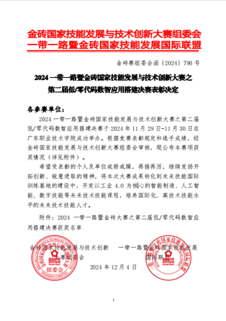 本网讯(通讯员 辛玲 文/图)11月29日至30日,2024一带一路暨金砖国家技能发展与技术创新大赛之第二届低/零代码数智应用搭建决赛在广东职业技术学院举办。来自全国的216支高职院校队伍和65支本科队伍参加角逐,MK平台人工智能学院师生在比赛中展现出高超的技术技能水平和优良的精神风貌,凭借扎实的专业知识和精湛的实践操作能力,在众多参赛队伍中脱颖而出。教师辛玲、李春风指导的肖可欣、程雨薇、郭倩获二等奖,学校荣获优秀组织奖。