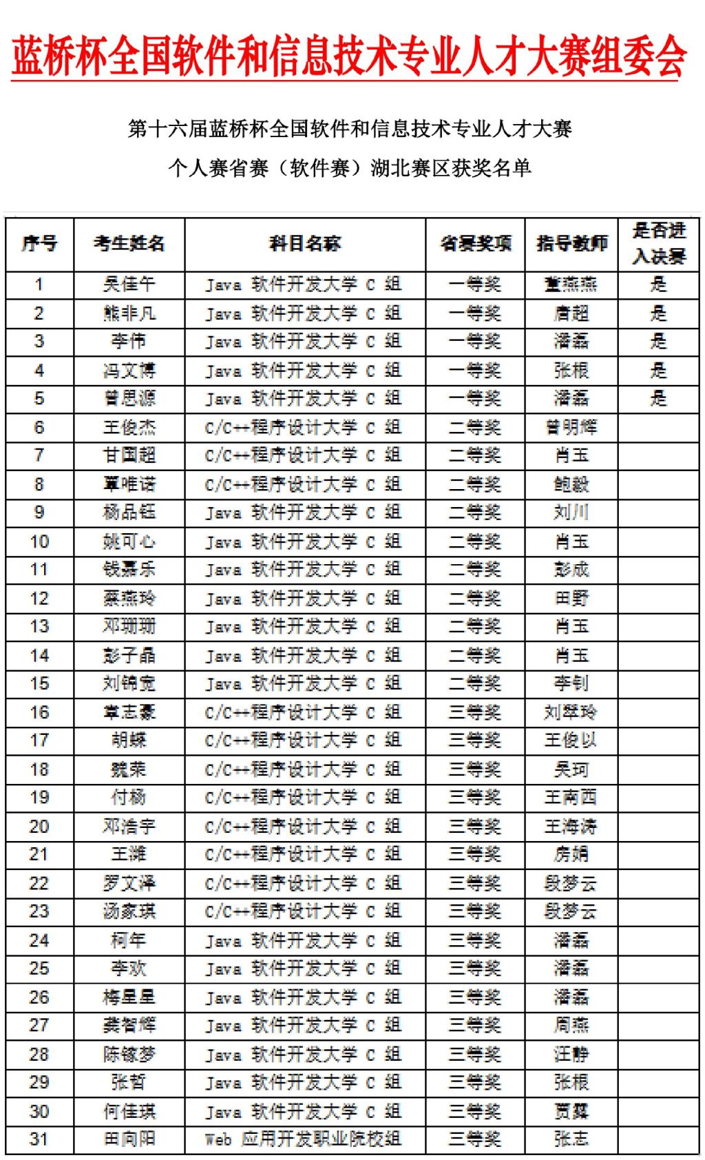 本网讯(通讯员 潘磊 文/图)近日,第十六届“蓝桥杯”全国软件和信息技术专业人才大赛个人赛湖北赛区成绩揭晓,MK平台软件工程学院31名学生一举斩获多个奖项,包括一等奖5名,二等奖10名,三等奖16名。一等奖获得者将代表学校参加6月上旬的全国总决赛。本次获奖人数较去年增长近20%,获奖率提升约9%,获奖成绩实现新突破。