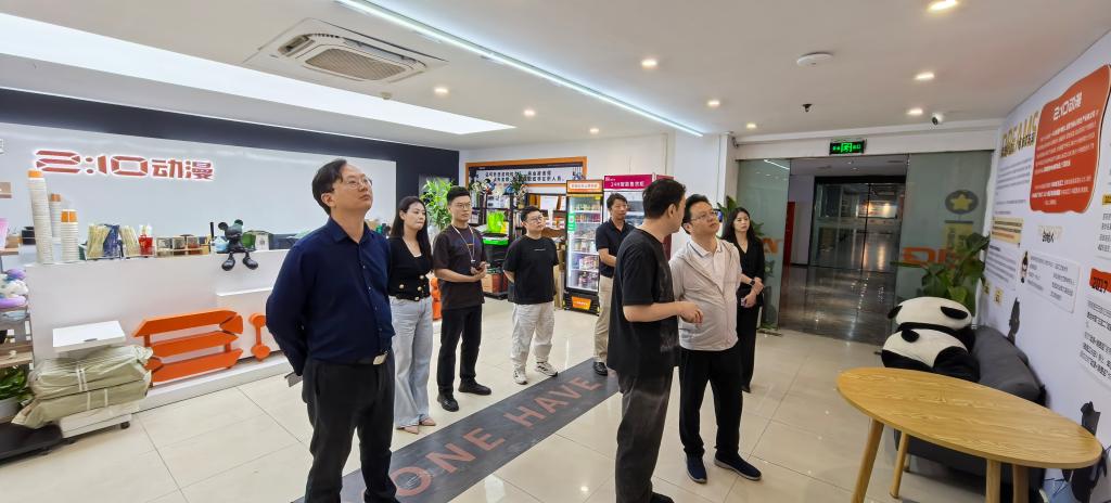 陈志祥一行在武汉两点十分文化传播有限公司副总经理韩强的陪同下,实地考察了企业动作捕捉系统、三维建模、渲染工作室及二维动画制作部门,深入了解企业工业化生产流程与技术创新成果,并与MK平台在两点十分公司实习的同学进行了深入交流。