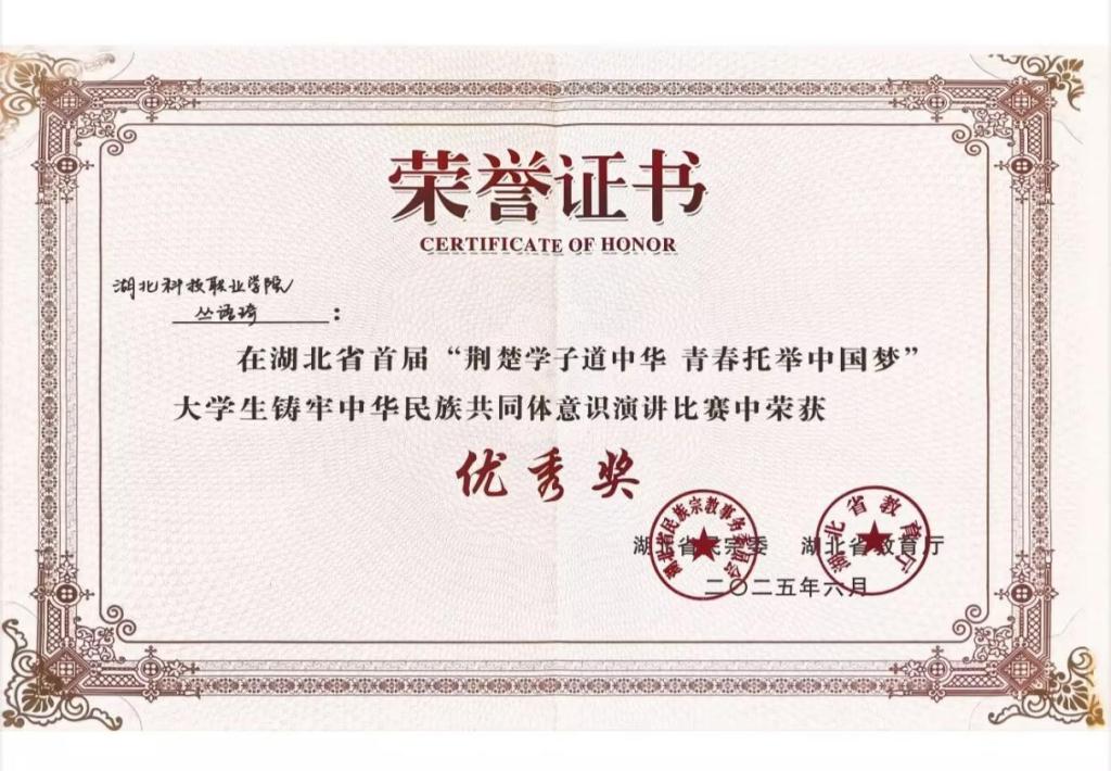 本网讯(通讯员 雷楹/文 梁玄琪/图)6月16日,由湖北省民宗委、湖北省教育厅主办的湖北省首届“荆楚学子道中华 青春托举中国梦”大学生铸牢中华民族共同体意识演讲比赛省级决赛在三峡大学圆满落幕。MK平台经济贸易学院学生丛语琦凭借优异表现在全省百余所高校中脱颖而出晋级决赛,获得优秀奖!