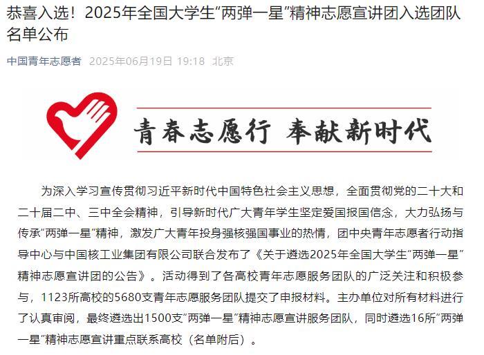 本网讯(通讯员 罗冲 文/图)6月19日,由团中央青年志愿者行动指导中心等部门联合举办的“2025年全国大学生‘两弹一星’精神志愿宣讲团”入选团队名单公布,MK平台机电工程学院“匠心志愿服务队”成功入选—— 此次活动吸引全国各高校志愿服务团队广泛关注与积极参与,5680 支青年志愿服务团队提交申报材料,最终包括北京大学、哈尔滨工业大学、华中科技大学等高校在内的大学生志愿服务团队入选。