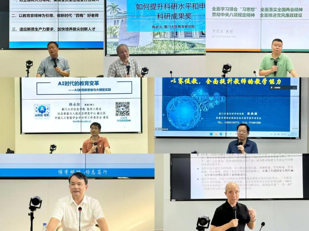 理论引领,夯实根基。培训邀请多位知名专家学者,为学员带来了7场精彩讲座。厦门理工学院洪认清教授以《加强师德师风建设做新时代“四有”好老师》为题,系统解读习近平总书记关于师德师风的重要论述,强化教师立德树人的使命意识;厦门大学教育研究院陈武元教授聚焦科研能力提升,从选题创新到成果申报进行系统指导,帮助教师突破科研瓶颈;厦门大学公共事务学院副院长罗思东教授深入阐释中央八项规定精神与党风廉政建设要求,筑牢教师廉洁从教思想防线;厦门大学赖永炫教授以《AI时代的教育新思维和6种稀缺能力》为主题,剖析人工智能对教育的深远影响,指引教师把握未来教育方向。厦门市教育科学研究院职教室主任陈振源分享《以赛促教,全面提升教师教学能力》的实践经验;闽南师范大学校长张龙海教授讲授《教育科研助推高校治理创新》,解析科研助力教育管理创新的路径。厦门大学特聘教授庄国土教授则从“一带一路”倡议出发,分析教育合作新机遇,拓宽教师国际视野。