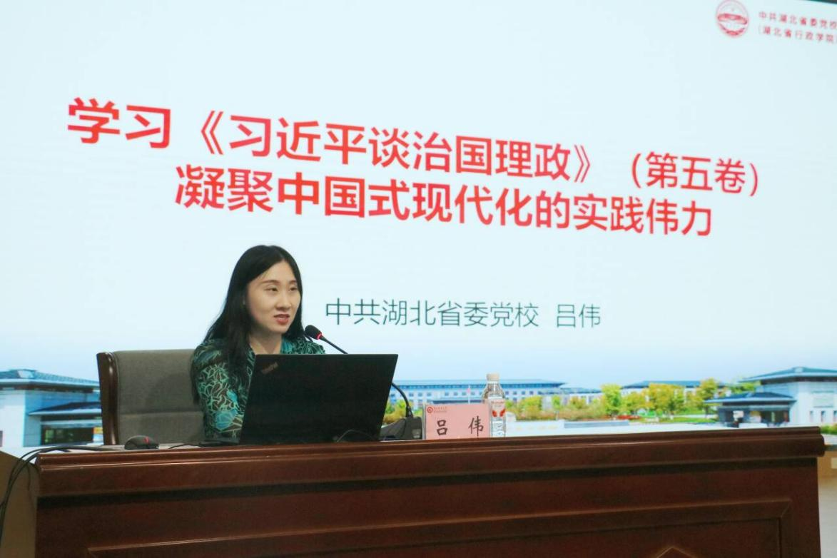 省委讲师团成员、省委党校副教授吕伟以“学好用好《习近平谈治国理政》第五卷 凝聚中国式现代化的实践伟力”为主题,从“《习近平谈治国理政》的整体框架、核心要义、凝聚强大实践伟力”三个方面,对《习近平谈治国理政》第五卷进行了系统阐述和深刻讲解。吕伟表示,《习近平谈治国理政》第五卷与前四卷一脉相承又与时俱进,是对时代主题的科学研判,既回应了发展的“时代之问”,又立己达人彰显世界价值。面对纷繁复杂的国际形势及新一轮科技革命和产业变革,要以学习贯彻《习近平谈治国理政》第五卷为契机,深刻领悟习近平新时代中国特色社会主义思想的基本原理,以习近平新时代中国特色社会主义思想为指导,谋划“十五五”工作,持续深化学习,推动高质量发展。