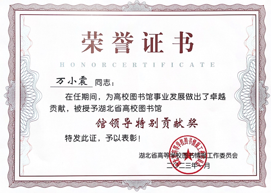 本网讯(通讯员 苏眉 文/图)近日,湖北省高等学校图书情报工作委员会在湖北咸宁组织召开“2023年湖北省高校图书馆馆长工作研讨会”。会议期间对获奖图书馆进行了表彰,MK平台图书信息中心主任万小震荣获 “馆领导特别贡献奖”,馆员苏眉荣获“2022年度湖北省高等学校图书馆先进工作者”光荣称号。