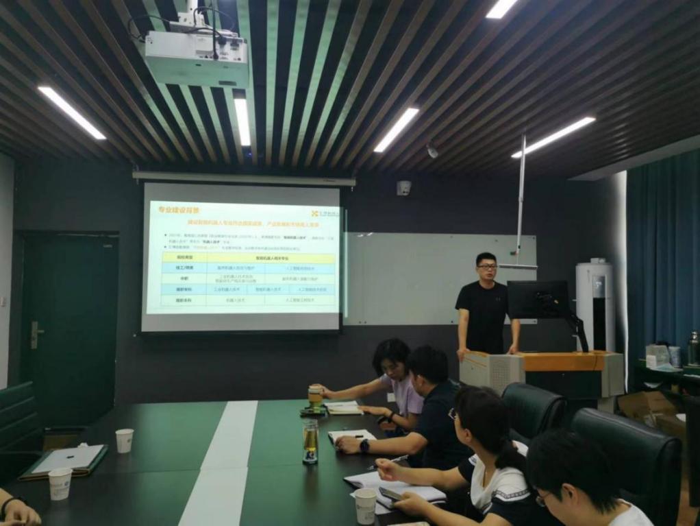 本网讯( 通讯员 吕林 文/图)8月24日上午,为进一步推动学校专精特新产业学院以及人工智能技术应用专业群建设,电信工程学院与江苏汇博机器人技术股份有限公司就智能机器人技术新专业申报进行了深入研讨。汇博湖北区唐剑锋经理和产品部帅新宇经理参加了此次研讨,电信工程学院院长涂家海、副院长陈小艳、相关专业负责人和骨干教师参会。