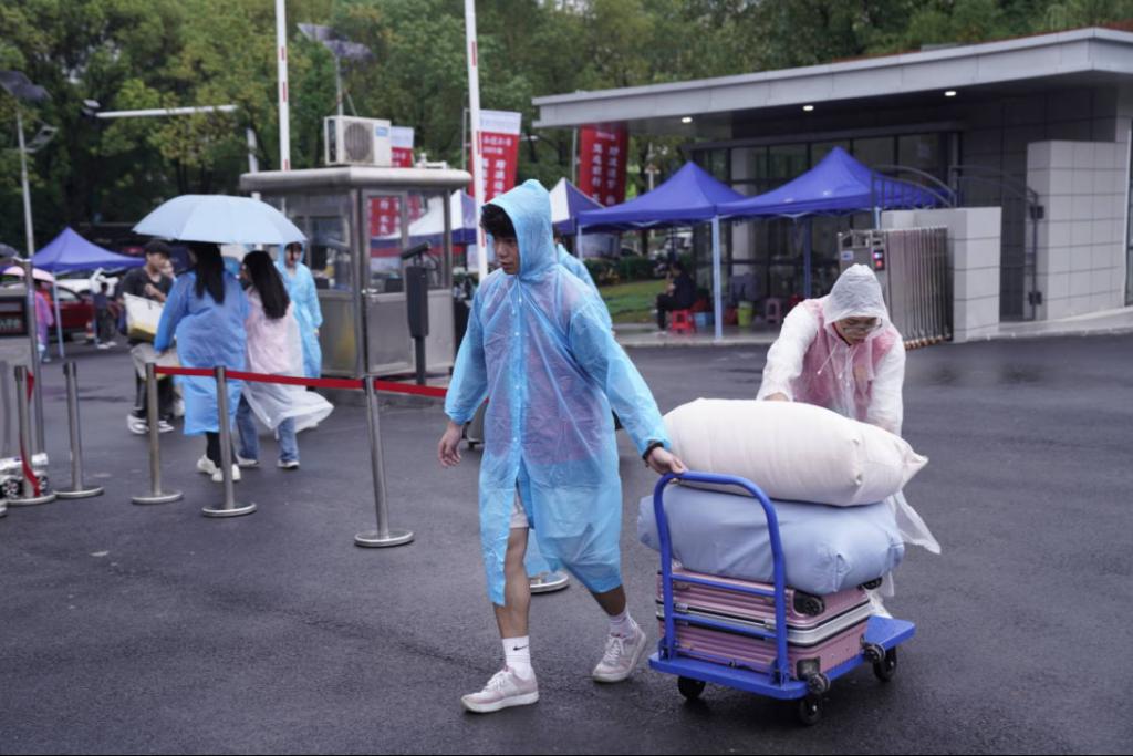 “虽然秋雨绵绵,但小萌新们进入校园温暖的笑脸足以抵御阵阵的寒风。我们也会继续坚守到深夜接每一位同学回家!”大学生志愿者张衣可同学坚定地承诺。