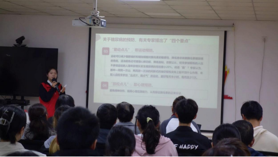 活动现场,志愿者们通过知识讲解、观看视频、学健康操等形式向社区居民宣传糖尿病的相关知识和防治注意事项,普及如何通过健康合理的饮食和适当规律的运动来控制血糖,提高老年人对糖尿病的了解和重视。志愿者们协助医护人员进行血糖、血压的测量,进行基础的体检,帮助老年人计算体重指数。同学们用实际行动和真挚语言,让社区居民感受到温暖和关怀,也展现了大学生良好的精神风貌。