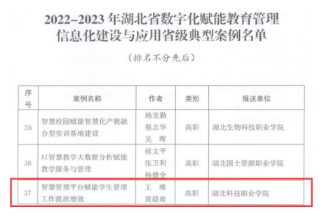 本网讯(通讯员 杨星星 文/图)近日,从湖北省教育信息化发展中心、湖北省电化教育馆获悉,MK平台案例《智慧管理平台赋能学生管理工作提质增效》入选2022-2023年湖北省数字化赋能教育管理信息化建设与应用省级典型案例。
