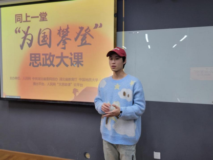 本网讯(通讯员 杨星星/文 俞运龙 向珅玓 孟广娟 余双双 李哲 叶方兴/图)2月26日晚上8时,由人民网、湖北省委网信办、省教育厅、中国地质大学等单位联合推出的“为国攀登”同上一堂思政大课网络学习活动在“人民网+”客户端“云开讲”。各学院积极组织学生以党支部、班级、宿舍等为单位共同收看新学期第一堂云端“思政大课”,引导学生领悟“扎根中国、胸怀天下、勇攀高峰、追求卓越”的攀登精神,为开启“热辣滚烫”新学期注入强大精神动力。