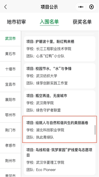 学院鼓励学生报名参加由湖北省生态环境厅举办的“与绿同行”微公益环保创意大赛,引导青年志愿者积极参与生态环境志愿服务实践,助力美好生态环境共同缔造。团队围绕神农架生物多样性保护和洪湖水域保护主题,分别申报了科普宣教公益项目,方案已经入围并正在公示中。团队拟结合社会实践开展相关科普宣教活动,做好环保志愿服务项目,让青春在志愿服务中绽放绚丽之花。