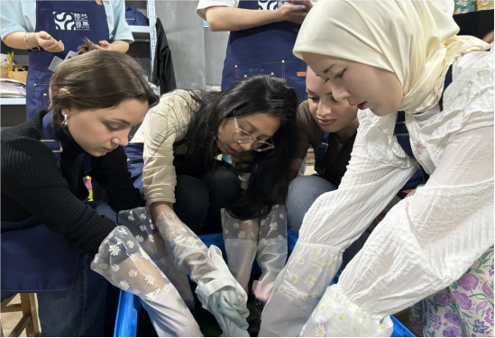 一试一思、一布一染、一绢一韵。19日,中南民族大学何红一教授及留学生一行前往鲁巷校区传媒艺术学院,走进学校非遗研究中心“艺守青蓝”非遗植物蓝染课堂。课堂上,主讲教师欧亚梅从我国传统非遗植物蓝染文化切入,为留学生介绍了蓝染文化情景与工匠技艺精神。