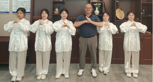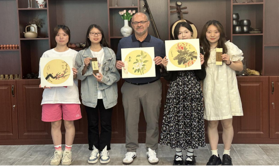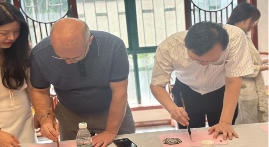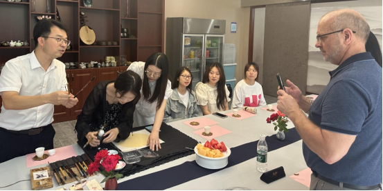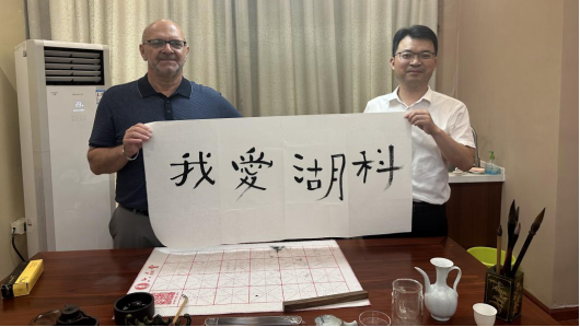 写书法,墨香雅集共传承。在书法体验环节,电信工程学院党总支书记谢永平为Chester Wilson George老师和同学们介绍了中国书法的历史与渊源,经济贸易学院党总支书记冷磊现场示范教学,Chester Wilson George老师在冷磊书记的指导下,一笔一画写出“我爱湖科”,表达了对MK平台的深厚情谊和无限热爱!