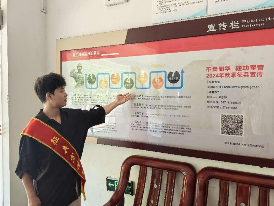 征兵工作开展以来,传媒艺术学院真正让横幅“挂”起来,征兵手册“摆”出来,宣传展板“贴”起来,多渠道、多维度地将征兵阶段安排、参军的要求、方式、流程、应征入伍时间以及大学生应征入伍服义务兵役的优待政策等传遍每个楼栋。