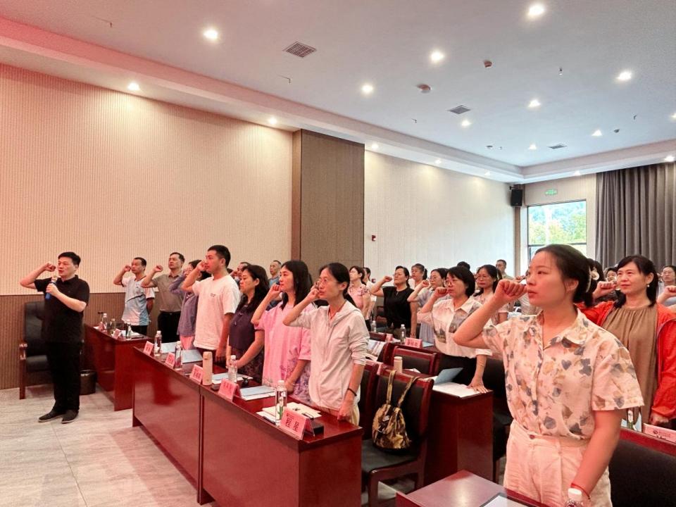 开班仪式前,由武汉市旅游学校教师皮力带领全体学员重温教师誓词。武汉经济技术开发区职业技术学校杨春侠老师作为学员代表发言。
