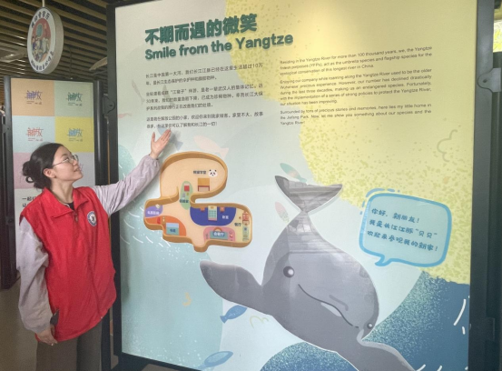 “长江是中国第一大河,我们长江江豚已经在这里生活超过10万年,是长江生态保护的伞护种和旗舰物种……”湿地科普馆内,志愿服务队员正在为前来参观的游客科普长江江豚知识,号召大家共同做长江微笑精灵的守护者。“长江江豚面临的威胁主要都来自人类活动的影响,减少使用塑料制品、妥善处理电池等特殊废弃物……举手之劳,就可以为江豚保护献出一份力,希望通过我们的宣传讲解,能够让人们真正了解江豚现状,深刻认识到江豚保护的重要性,共同守护长江精灵的微笑。”志愿服务队队员陈筠说。