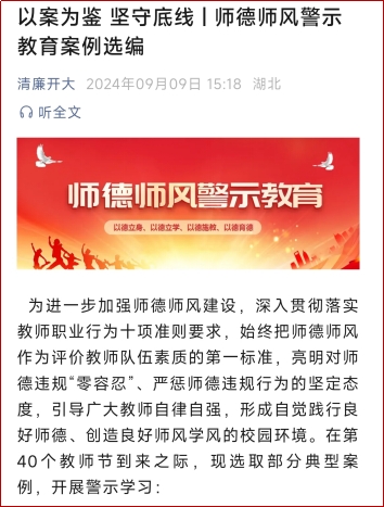 教师节前“吹廉风”,坚守底线不放松。在第40个教师节来临之际,为确保广大师生家长度过一个廉洁清新的教师节,校纪委、监察专员办公室利用“清廉开大”微信公众号向全校教师推送《以案为鉴,坚守底线:师德师风警示教育案例选编》,用身边人身边事,进一步严明纪律规矩,增强纪法意识,释放全面从严、一严到底的强烈信号。