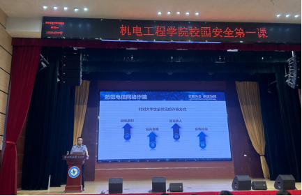 增强意识,筑牢安全堡垒。陶涛从人身安全、财产安全、公共安全、总体国家安全观四个维度出发,从与高校学生密切相关的“三贪”作为切入点,以透彻的鲜活案例启发学生,以详细的真实数据说服学生,用真理的力量教育引导学生,为2024级新生上了一堂精彩的安全教育课。课上,陶涛还就防范电信网络诈骗做了重点介绍,通过通俗易懂、深入浅出的话语表达,让学生收获别样的体验和思考,教育新生切实增强安全防范意识,促使安全意识内化于心、外化于行。