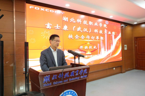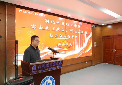 富士康武汉模具单位经理周三要在讲话中点明了模具制造在工业中的核心地位,并分享了富士康在全球范围内的重要地位和广泛合作影响力。他表示,校企合作是一个新的开始,期待未来能够收获丰硕的果实。并勉励同学们尽快完成角色转换,不断深入认识企业,了解行业发展,提高个人专业能力,成为企业未来的工程师与干部。