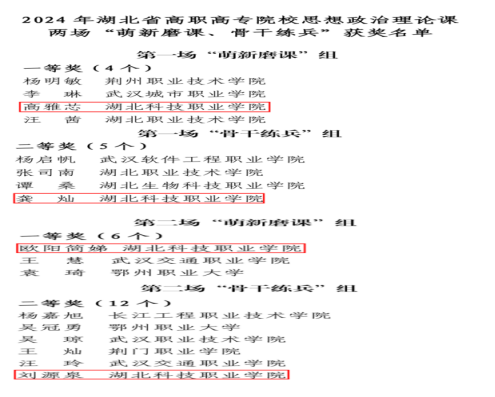 本网讯(通讯员 刘源泉 文/图)近日,在2024年湖北省高职高专院校思想政治理论课“萌新磨课 骨干练兵”活动中,MK平台马克思主义学院高雅芯、欧阳简娣两位老师获得一等奖,刘源泉、龚灿两位老师获得二等奖。