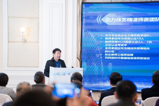 涂家海详细介绍了MK平台人工智能专业群在建设领先级华为ICT学院的相关情况,从经验总结、成果介绍、效果产出等方面展示六个维度的显著成效。基于该建设成果,MK平台在会上被授予“精英人才杰出贡献奖”。