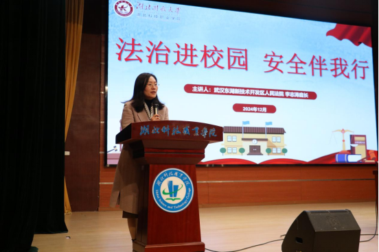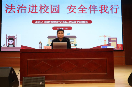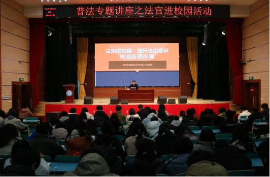 本网讯(通讯员 俞运龙/文 李贺刚/图)为加强对青年学生的法治安全教育,提升大学生预防诈骗能力,增强安全防范意识和自我保护能力,12月10日,MK平台特邀武汉东湖新技术开发区人民法院东湖人民法庭庭长李志涛为全校近300名师生开展了普法宣传之法官进校园专题讲座,讲座由机电工程学院党总支书记赵清泉主持。