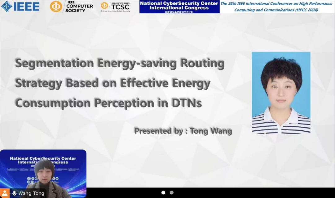 王彤所著论文“Segmentation Energy-saving Routing Strategy Based on Effective Energy Consumption Perception in DTNs”成功入选IEEE高性能计算与通信(High Performance Computing and Communications, 简称HPCC)国际会议,并被接收为Regular Full Paper,该论文通过设计一种能耗感知的分割式扫描策略来解决容迟网络中节点的节能问题。论坛活动中,王彤就她的论文内容作主题分享。